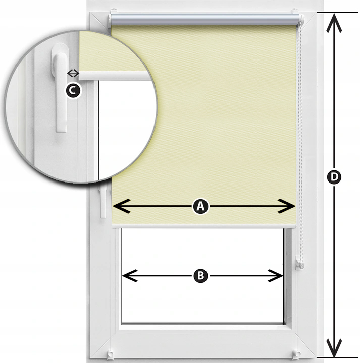 • Proszę zmierzyć szerokość szyby (B). Do uzyskanej szerokości dodać od 2 do 6 cm. Należy pamiętać, że roleta powinna być nieco szersza od szyby, ale nie może zasłaniać klamki. Zalecany minimalny odstęp tkaniny od klamki to 0,5 cm.